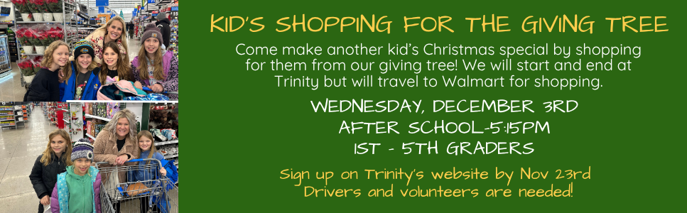 Have your kids join us on December 3rd and have a chance to give back to another child this Christmas! We will be meeting at Trinity after school, grab a snack and then head in our small groups to Walmart to go shopping! We will return to Trinity to wrap our gifts.